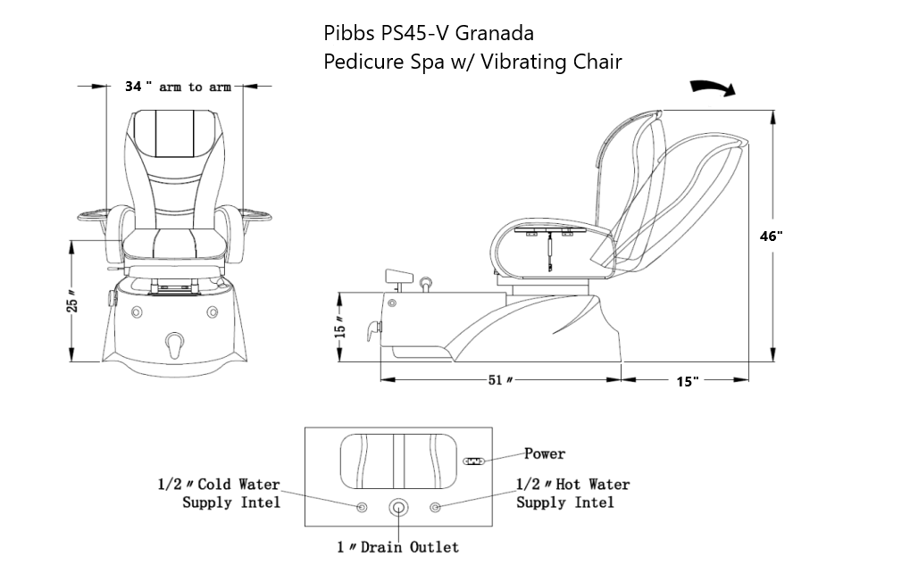 DescriptionUpgrade your salon with the Pibbs PS45-V Granada Pedicure Spa, the latest innovation in Pibbs’ trusted line of pedicure chairs designed for exceptional quality, durability, and client comfort. Built on a sturdy fiberglass base, this spa is powered by the industry-leading Luraco Magnetic Jet system, proudly made in the USA. Known as the best pedicure jet available, the Luraco delivers dual high-powered jet streams for an unbeatable whirlpool experience—while staying whisper-quiet. It’s also easy to install, clean, and service, making it as convenient for technicians as it is relaxing for clients. The Granada’s sleek European design is enhanced with LED lighting and an overflow drainage system, creating both style and functionality. The luxurious chair top features a 6-function vibration massage system, plus swivel, recline, and forward/backward slide adjustments to ensure every client finds the perfect position. An adjustable front footrest raises and lowers smoothly for maximum comfort during every service. * Please allow 2 - 4 weeks for shipment when selecting the spa beige chair top.