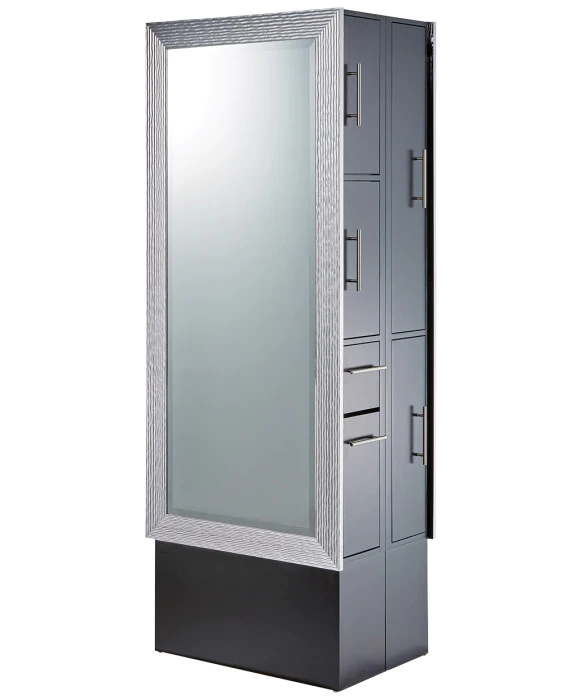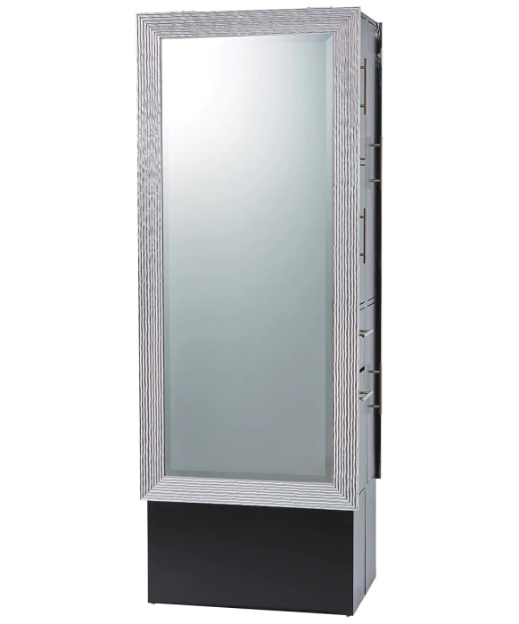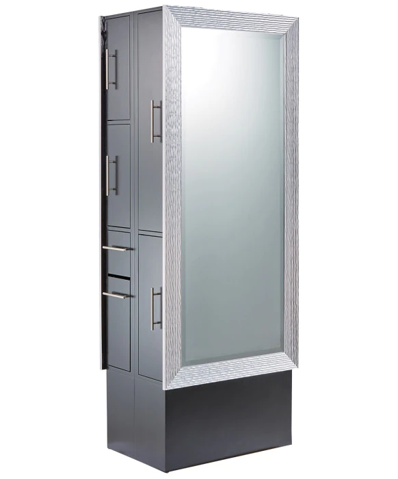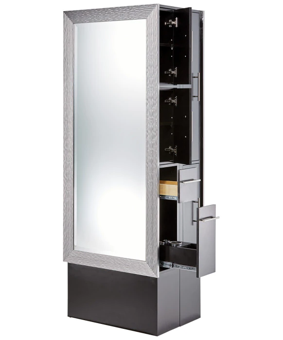 DescriptionThe Pibbs Wave Isola Double Sided Station will add style and functionality to any salon or spa. Available in a black or silver frame, the 2 extra-large, full-length mirrors are finished with a vibrant polished wave design. The wood styling station is available in black & white and features durable metal bar pulls, 4 tool holders – 2 with wire access to keep the drawer closed while using your tools and (8) spacious storgae cabinets. The Pibbs Wave Isola Double Sided Station has a small footprint with plenty of storage space and is designed to be used by two stylists at the same time. If you are looking for a versatile styling station to help save space that offers great design and functionality then you have found the one!! We also offer the Pibbs Wave Salon Mirror and the Pibbs Wave Salon Mirror & Storage Server for design continuity across your whole salon.