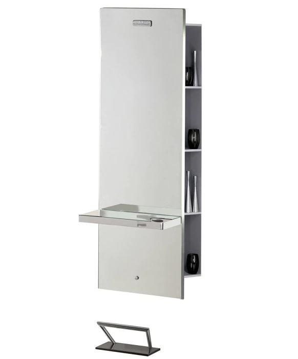 DescriptionMinimalism has never looked so good! The Lunar styling unit is Manufactured in Italy by Salon Ambience and boasts a refined three-quarter-length mirror with elegant backlighting, and comes complete with a center work shelf available in seven unique designs. The Lunar also comes complete with a blow dryer holder and footrest that continues the clean, geometric style found with the mirror. With a perfect combination of style and convenience, the Server unit, in painted grey metal, fits between the wall and a selection of Salon Ambience work units. With 4 shelves for products, the Server adds an extra level of functionality and storage space to any mirror styling station.