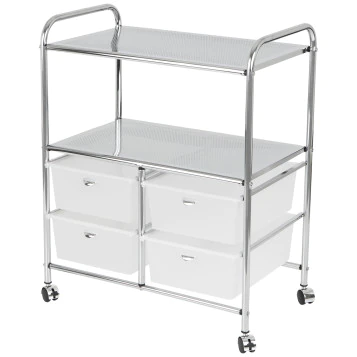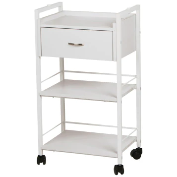 DescriptionThe 1019A Skin Care Spa Utility Trolley with Locking Drawer by Silver Fox is equipped with four easy-roll caster wheels, making it easy to keep everything you need within arm's reach! This versatile trolley table features a flat top that can double as an additional work surface and two shelves with guardrails to prevent items from falling off, while the spacious drawer offers additional storage space and can be locked for added security. The durable metal frame and classic white color give the 1019A an elegant look while ensuring that it is built to last!