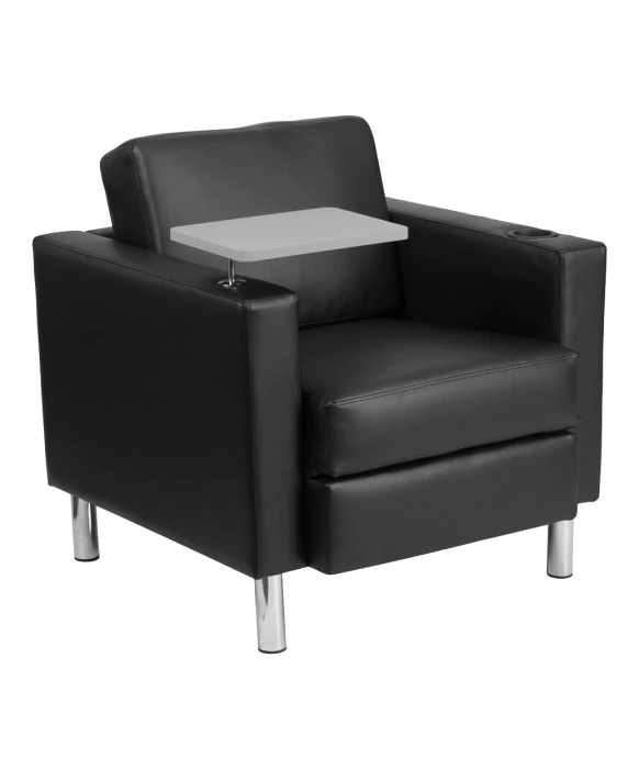 DescriptionThe Square Waiting Chair w/ Tablet Arm by Flash Furniture is the perfect chair for any salon waiting area. Flash truly thought of everything when designing this chair, as it includes a built-in cup holder in the left arm rest, swinging tablet arm on the right, and even comes with two metal rods to adjust height! This contemporary lounge chair also features plush cushioning in the seat and back, as well as padded armrests to ensure guests' maximum comfort. The tablet arm is a light gray color, and the chair comes in your choice of either black or gray upholstery.
