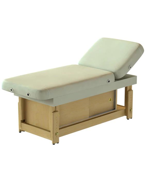 DescriptionThe Stationary Face & Body Table is Touch America's all-time best seller as it has proven itself to be an outstanding table during more than 20 years of production. This table has a beautiful, natural wood look with a maple finish. Its comfortable two-section top can be manually adjusted using a paddle-release tilt mechanism, lockable at any position from zero to 75. The base can be adjusted for an overall table height between 24"- 34". Durable and attractive, the Touch America Stationary Face & Body will provide you with years of value and trouble-free service. Sturdy Built-In Storage Shelf (as pictured for an additional $320.00)