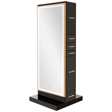 Absolutely. These stations are available in a wide range of colors, laminates, and design styles, from sleek and modern to warm and classic. This flexibility makes it easy to match your stations with your salon’s branding, décor, and overall design aesthetic. Double-sided stations are also available with full-length mirrors, half-length mirrors, shelves, extra storage and with gold, black and silver accents. In fact, many can be customized based on the colors and finishes that you want for your salon.