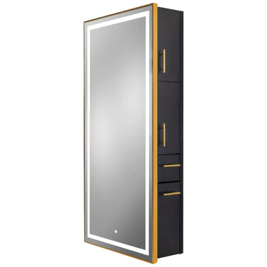 An LED wall-mounted styling station is a professional salon workstation that mounts directly to the wall and features an integrated or paired LED-illuminated mirror. The station provides storage, countertop space, and organization, while the LED lighting enhances visibility at the mirror. This combination creates a clean, modern workstation that supports precision services and elevates the overall salon aesthetic.