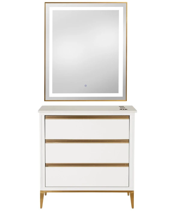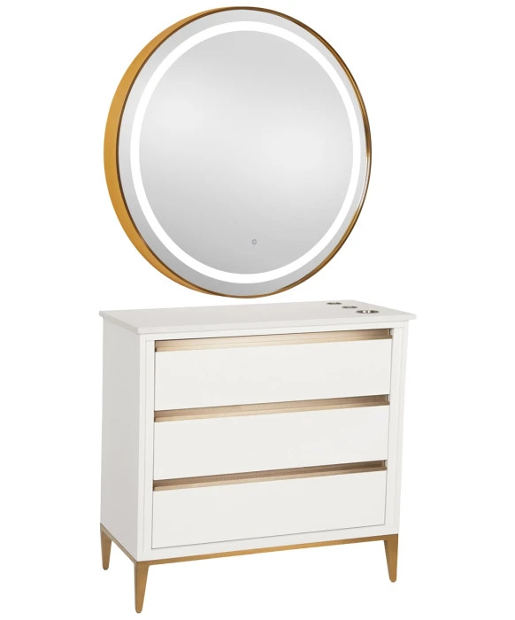 DescriptionThe Ventura 36” Vanity Styling Station & Mirror is built from solid wood and features high-end craftsmanship with close attention to intricate details to be appreciated by stylists and customers alike. The Ventura Vanity Station will add sophisticated elegance and a modern feel to any salon, spa or barbershop, and provides a clean, spacious work area for your stylists. This styling station features three extra large storage drawers that are accented with low-profile brushed gold metal drawer pulls. All three drawers are accompanied by soft-close bumpers and extensions to prevent unwanted noise in your salon, enhancing your client’s relaxing experience. The elegant quartz countertop is easy to clean and comes complete with 3 built-in appliance holders for your tools. The vanity cabinet sits on sturdy, brushed brass metal legs for support, and thus creates an open underside to allow for fast and easy cleanup. The Ventura Vanity styling station comes complete with a matching wood frame mirror or it can be upgraded with your choice of (4) modern LED mirrors that work perfectly with this styling station. This station is also available in a White or Black finish to perfectly match your salon's style and décor.