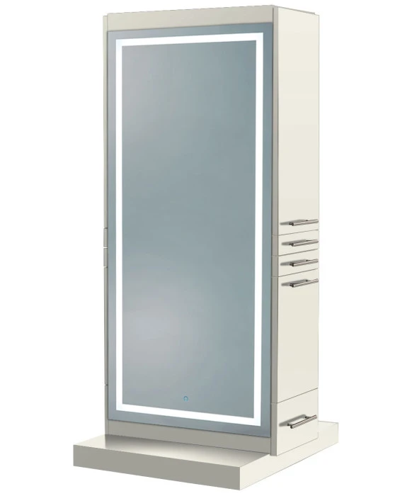 DescriptionThe Zeus Double Styling Station w/ Mobile Base & LED Mirror features a cabinet that is 100% Made in the U.S.A. and is double-sided to support two stylists working at the same time! This free-standing salon station ships to you in three fully assembled pieces and comes complete with two 66" full-length LED mirrors that will add a clean & modern touch to any salon, spa or barbershop. The LED mirror features a built-in LED lit frame with an easy and accessible on/off button. This luxurious salon mirror includes an embedded dimmable LED light that will bring refined glamour to your station and will give your client the opulent experience they deserve! Each side of the Zeus Double Sided Styling Station is identically equipped with an upper storage cabinet, two utility drawers, an appliance drawer with a slide-out tool panel to accommodate one blow dryer and two curling irons, as well as one lower drawer for additional storage! The Zeus Double-Sided Styling Station also features hidden wheels on the bottom for easy cleaning & maneuverability throughout your salon. This feature is great for any large salon as well as any cosmetology school looking to create an easy transformation from classroom to hands-on work space. This double-sided styling station is designed with style and functionality in mind, and is sure to upgrade any space that it consumes! The Zeus Styling Station is available in your choice of 40 laminate colors, so ask your Buy-Rite Beauty Sales representative today!